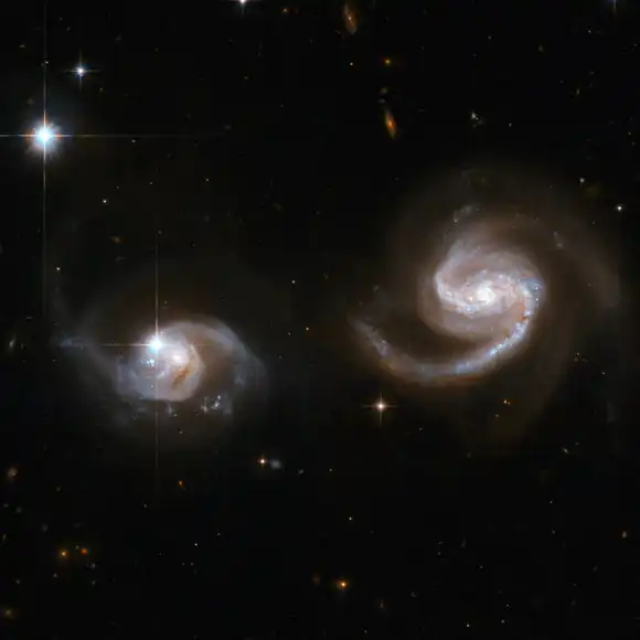 Arp 240 is a pair of similar-size spiral galaxies, NGC 5257 and NGC 5258. The galaxies are visibly interacting with each other via a bridge of dim stars. Both galaxies harbor supermassive black holes in their centers. Arp 240 is located in the constellation Virgo, approximately 300 million light-years away. (With the exception of a few foreground stars from our own Milky Way all the objects in this image are galaxies.)