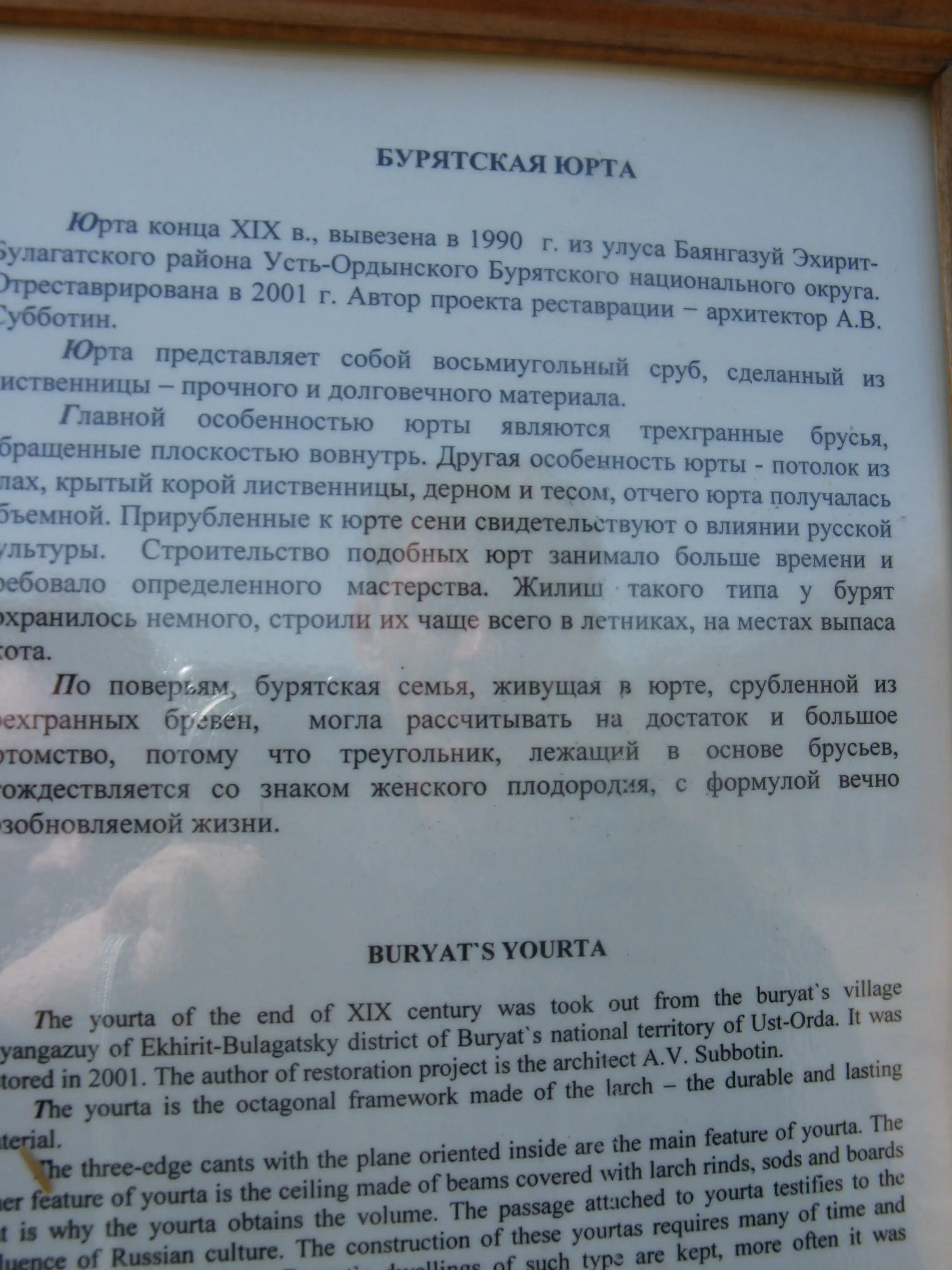 За русским поселением на высоком берегу Ангары открываются бурятские поселения: летний улус и зимний улус. В летнике 6 восьмистенных деревянных юрт 19 века. Рядом печь для хлеба и навесы. Для зимника вывезен из улуса шутхулун, дом тайши (старшины) Александрова и дом Степанова из улуса баянгазуй. Дополняет все это маломорский бурятский рыбацкий стан – жившие по берегам Байкала буряты, как известно, были не только скотоводами, но и промысловиками-рыбаками.