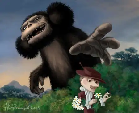 "Когда то я жил в густом тропическом лесу. Однажды я проснулся рано утром и пошел немного погулять и подышать свежим воздухом. Гулял, гулял и вдруг около большого фруктового сада увидел несколько ящиков с апельсинами. Так как я был голоден, я залез в один из них и стал завтракать. Я съел целых два апельсина, и мне стало трудно передвигаться, поэтому я лег поспать прямо на фруктах.