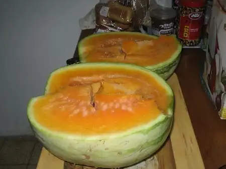 Зайдя на кануне в один израильский супермаркет мы увидели арбуз мягко говоря не обычного цвета, на нем красовалась надпись "Оранжевый арбуз" мы решили его купить попробовать что же это за чудо такое, оказалось на вкус как обычный красный арбуз, но цвет это класс конечно!