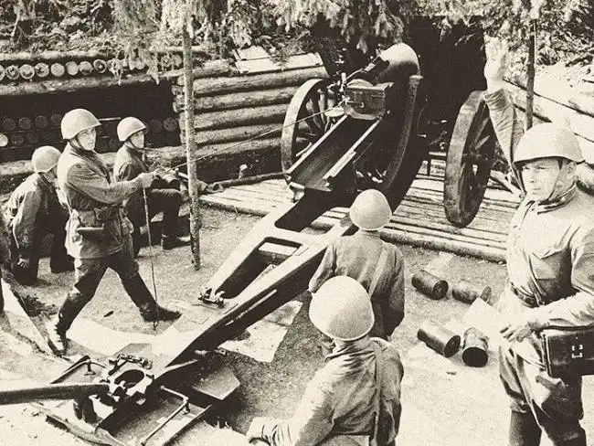 Лучший орудийный расчет подразделения капитана Хлебникова ведет огонь с закрытой позиции. Справа — командир орудия младший сержант комсомолец Д. Калякин.
