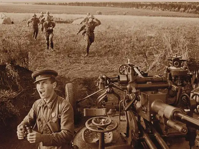 Артиллеристы, получившие новое боевое оружие, дают торжественную клятву.
