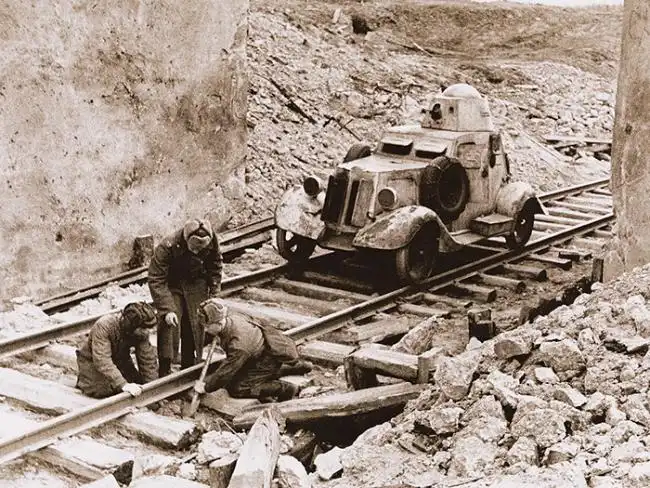 Экипаж бронемашины лейтенанта В. Н. Кохманского за ремонтом железнодорожного полотна.