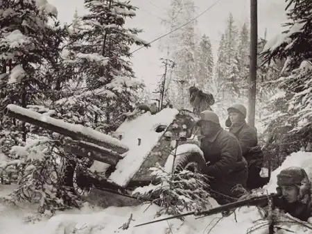 Орудийный расчет лейтенанта Зуева проводит орудие через лесные заросли на новый огневой рубеж.