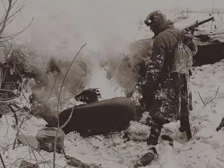 Расчет ПТР сержанта Павла Тарасова под прикрытием дымовой завесы сближается с вражескими танками.