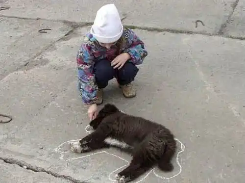 А почему жесть? Собачка вроде живая, девочка решила ее нарисовать (помните, как Незнайка в мультике вазочку обводил?), только и всего. А то насмотрелись киношек с кучей трупов на асфальте и мозгами по стенам, вот ассоциативный ряд какой попало и стал...