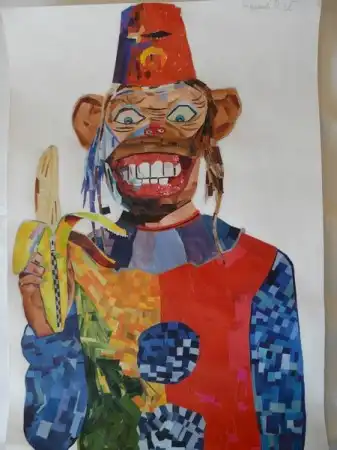 Обезьяна сделана из мелких кусочков вырезанных из журналов.