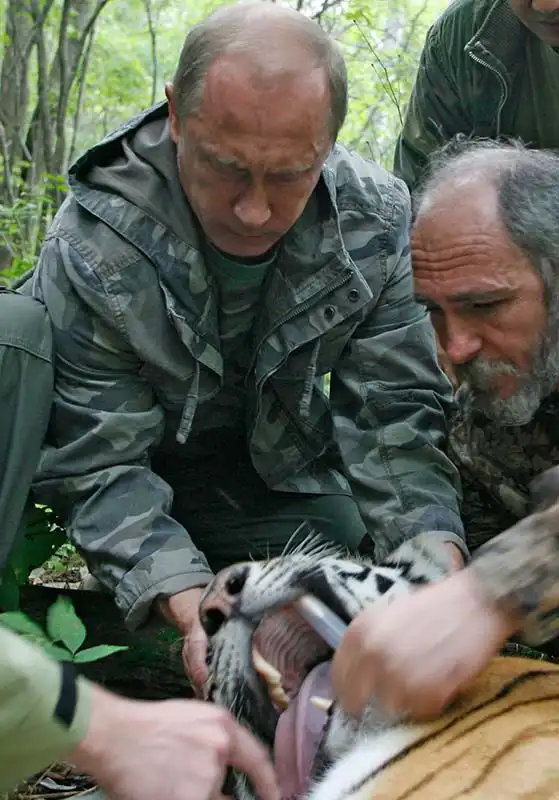 Премьер-министр России спас от неминуемой гибели съемочную группу программы "Вести", уложив метким выстрелом тигрицу, попавшую в ловушку и попытавшуюся освободиться из нее. В. Путин произвел выстрел из устройства для дистанционного обездвиживания животных и попал ей в лопатку. Когда животное уснуло, премьер надел на него GPS-ошейник и вместе с учеными измерил длину тигра от хвоста до носа. Говорят, что на прощанье Путин поцеловал тигрицу в живот и сказал ей: "До свиданья"