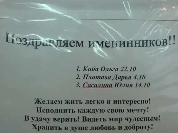 Я тут с людьми поработала... Ладно там фамилии Школа, Шняга, Топорок, Чухонцев, Гейко, Усик и некоторые другие... Смешнее сочетания имени и фамилии: Козлов Елисей, например, или Петров Рустам Ринатович, Анабелла Балабаненко, Зверева Леопарда Львовна... Еще Павлина и Анталия встречались.