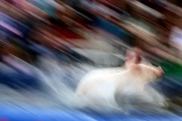 Специально обученные и пока еще не откормленные поросята соревновались в скорости на стадионе, который обычно используют для лошадиных скачек. Зрители с азартом делали ставки.