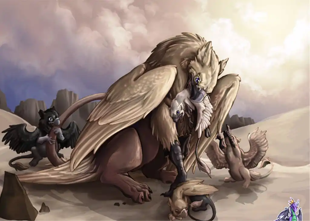 В древнегреческой культуре изображения грифонов встречаются на памятниках искусства доисторического Крита (XVII-XVI в.в. до н.э.), а затем в Спарте (VIII-VII в.в. до н.э.). Первое дошедшее до нас упоминание о грифонах принадлежит Геродоту (V в. до н.э). Он пишет, что это чудовища с львиными телами и орлиными крыльями и когтями, которые живут на крайнем севере Азии и охраняют от одноглазых аримаспов (сказочных обитателей севера) месторождения золота. Эсхил называет грифонов "птицеклювыми собаками Зевса, которые не лают". Греки полагали, что грифоны были стражами золотых копий скифов. Более поздние авторы добавляют массу подробностей в описание грифонов: это самые сильные из зверей (за исключением львов и слонов), свои гнезда они строят из золота, с героями и богами в конфликты не вступают.
