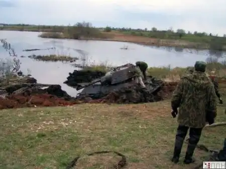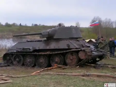 Танк был обнаружен в 2006 году в районе деревни Зеленкино. Боевая машина находится в 90 метрах от берега на глубине 12 метров, из которых один метр – это вода, а остальные 11 – торф. По словам Петрова, поисковики работают на месте затопления танка с 26 апреля. С применением спецтехники они размывали торф, чтобы подобраться к затонувшей машине. Теперь им предстоит подтянуть танк к берегу.