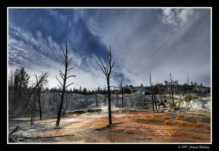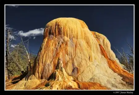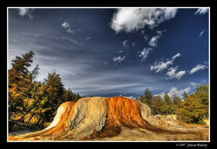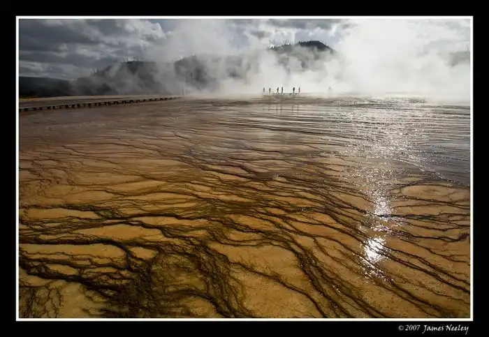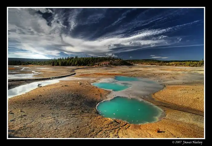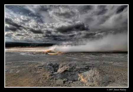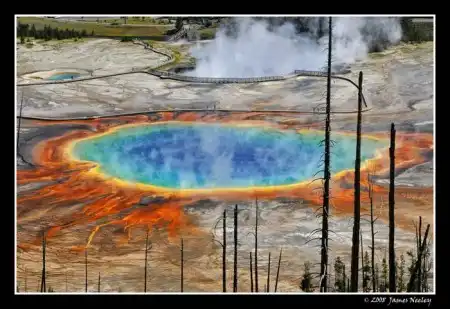 А там находится супервулкан, который уже как несколько десятков лет подает едва заметные признаки жизни..самое занимательное-что весь Еллоустон -сплошной кратер этого супервулкана, что выяснилось совсем недавно. Если этот вулканчик решит рвануь, то Америку накроет всю, а температура в мире понизится примерно а 6 градусов из за пепла, которого будет стока, что еще в течение примерно 2 лет солнца мы практически не увидим. Оо