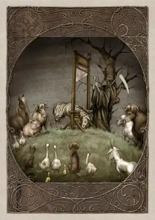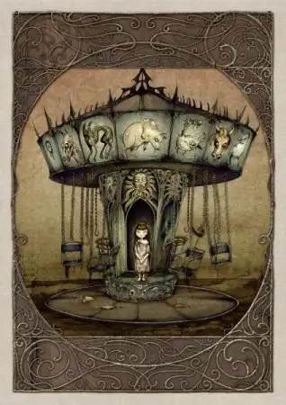 "Видения Александра Каште находят воплощение в сказочной оболочке, у него очень "визуальный" способ изложения мыслей. Когда он впервые связался со мной и рассказал о своих идеях и о том, какими он видит иллюстрации, я был сражен приведенными им описаниями! Богатство визуального мира, созданного Александром, поражает. Он знает каждого героя альбома так, будто все они живут у него дома - он знает про них абсолютно все: не только то, как они выглядят, но и как они говорят, как пахнут, движутся, думают, что едят, и что им нравится. Его описания были такими точными, что образы героев повествования тотчас формировались у меня в сознании - остававлось их только нарисовать. Королева Котят, девушка, живущая в карусели, жук и его хрустальный шар, а.Ура в домике улитки."