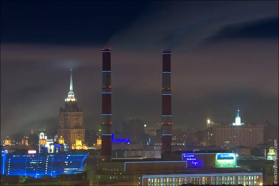 ТЭЦ-12 с Новогодним поздравлением, слева кислотно-синего цвета офисный комплекс «Легион», вдали гостиница Украина.