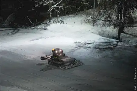 Тем временем, поздней ночью ратрак разравнивает горнолыжный склон...