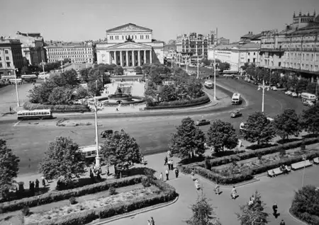 Большой театр. Обратите внимание на то, как раньше было организовано движение в центре.