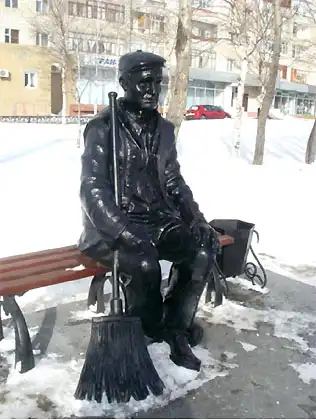 Дворник с метлой, сидящий на лавочке, теперь "прописался" на одной из центральных улиц города. Чугунное изваяние весит около 300 килограммов. Отливали его в Челябинске.