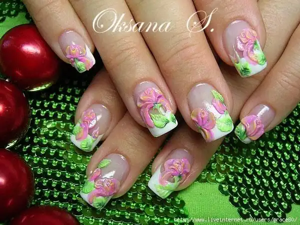 Французский маникюр =) я лично тоже предпочитаю свои ногти, а вот рисунок на своих ухоженных можно сделать и у мастера =) на правой ручке самой себе делать не очень удобно, всегда правая от левой чуть-чуть отличается
