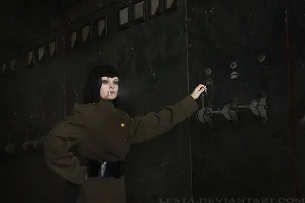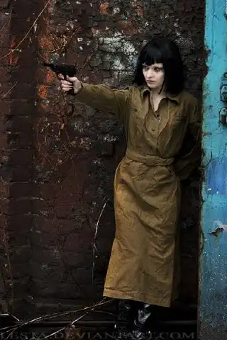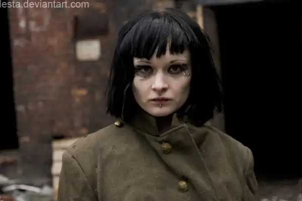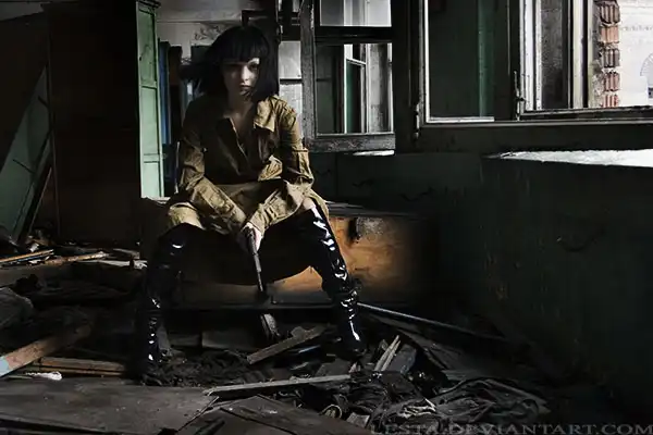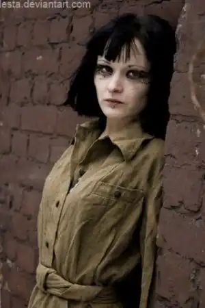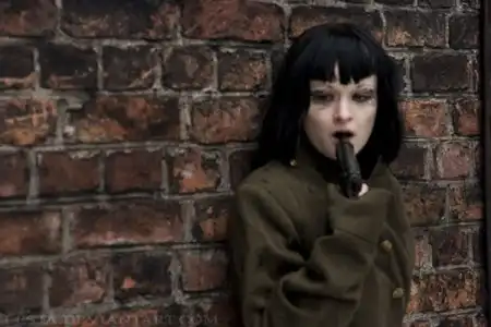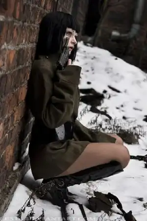 Какая-то суицидница(готесса),с вальтером П 38,если не ошибаюсь,с размазанной тушью,среди развалин.Посмотрел и пошёл дальше.