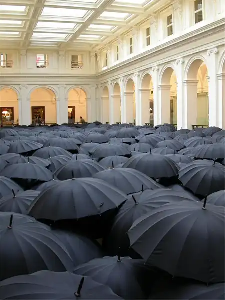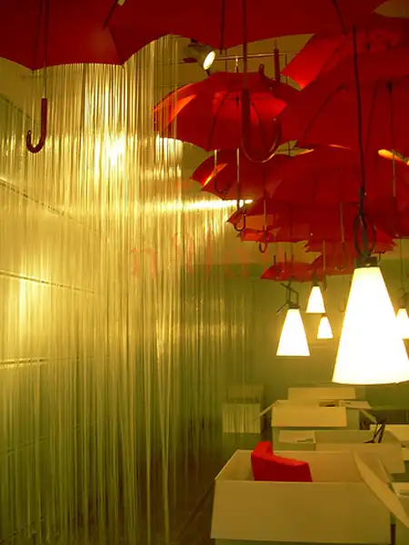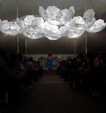 Очевидно, его можно носить с собой, а в случае появления дождевых облаков и самого дождя, раскрыть над головой и спасать себя от нежелательной влаги. Однако дизайнеры несколько другого мнения - ведь зонтики весьма удобный аксессуар для построения стильных декораций для, к примеру, показов мод. Действительно, почему бы и нет?
