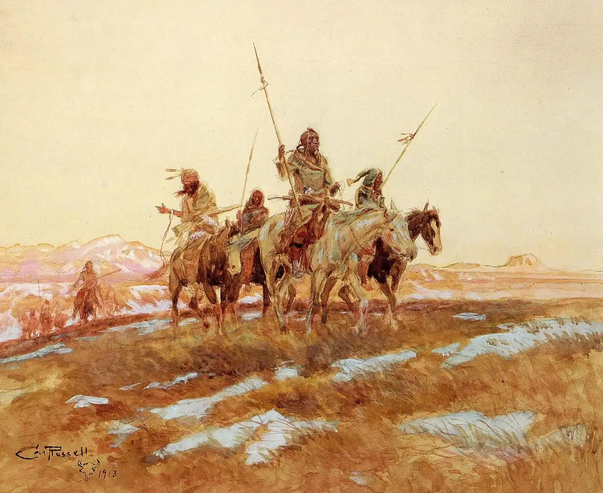 Рассел, Чарльз Марион, 1864-1926, американский художник . Он был одним из двух величайших и самых популярных художников американского Запада .Первый заработал себе на жизнь, как охотник, ставящий капканы и ковбоем, а затем стал переводить свою страсть к приключениям и американской дикой природы на холст для собственного развлечения. Работы наполнены движением ковбоев, коренных американцев (с которыми он проживал в течение периода времени), и галопирующей лошади.