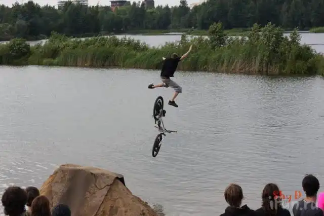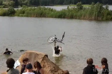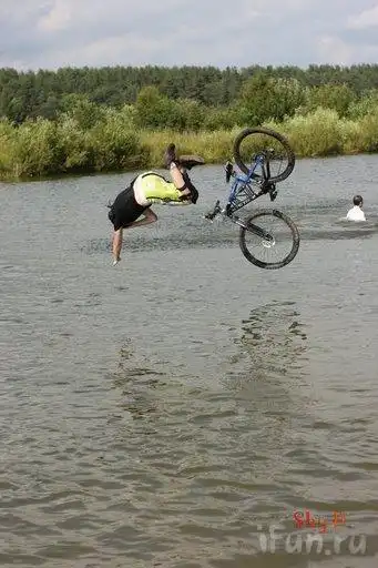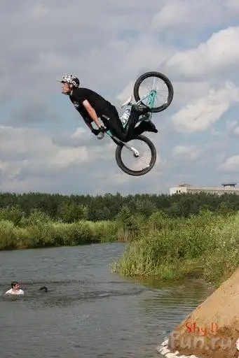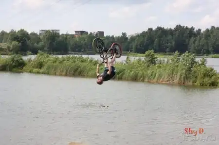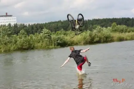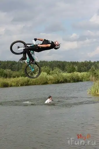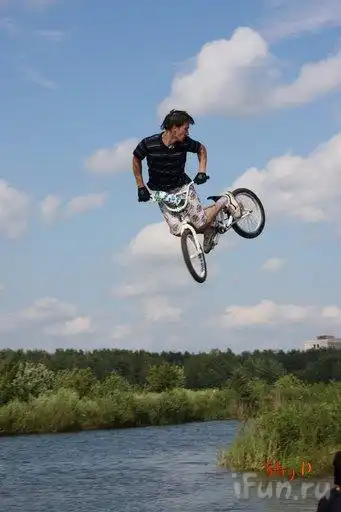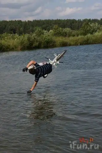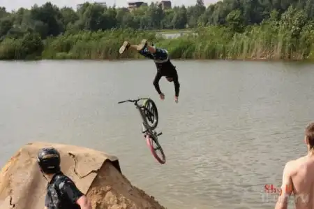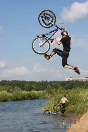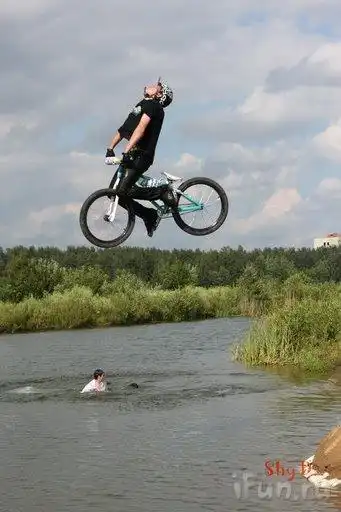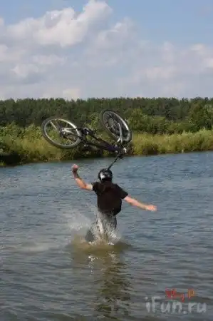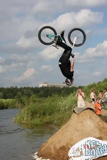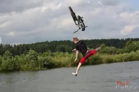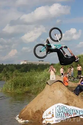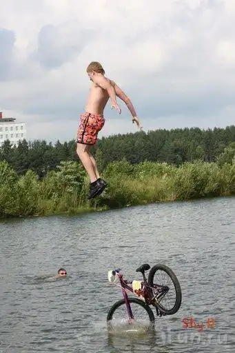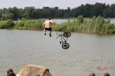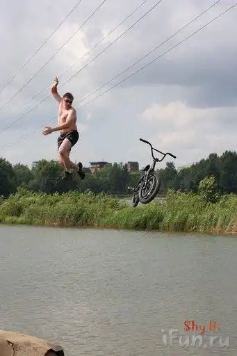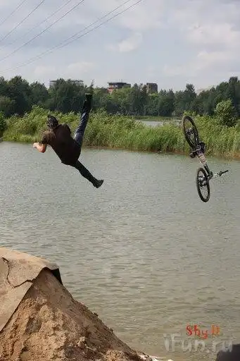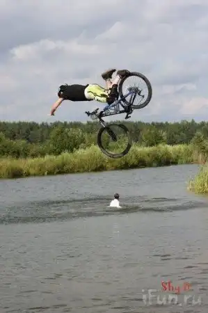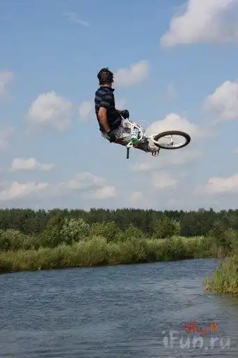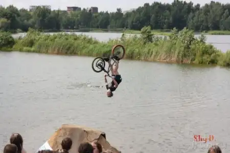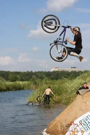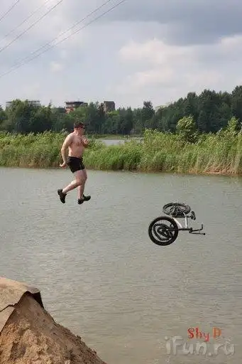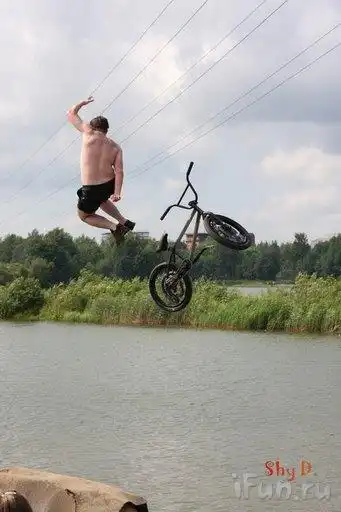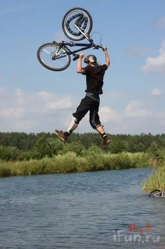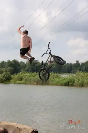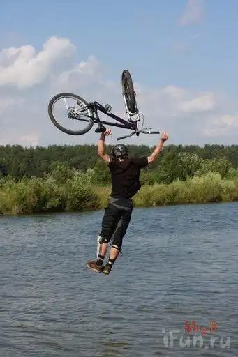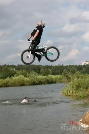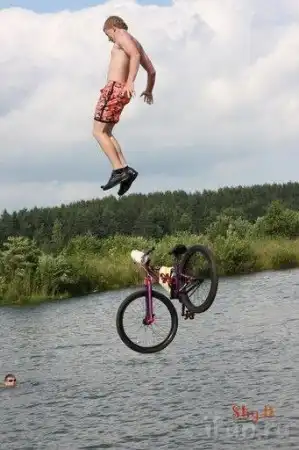 пусть либо без велика разбегаются и с вышки прыгают, либо на велике нормально приземляются