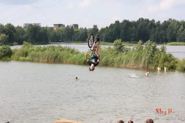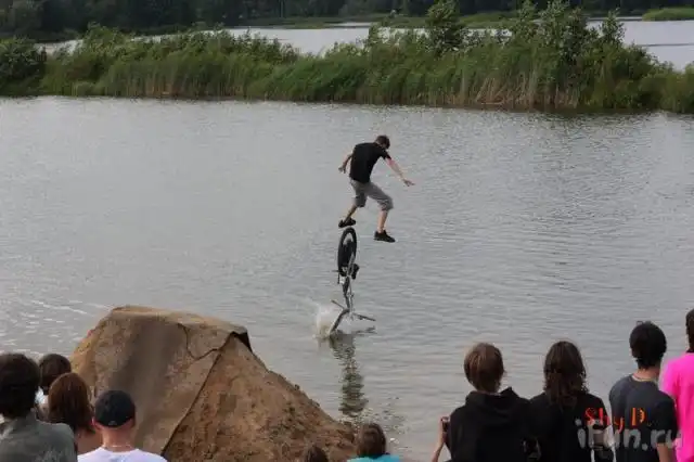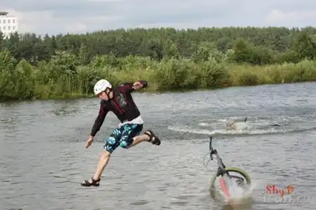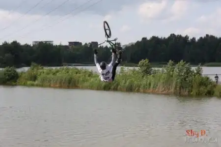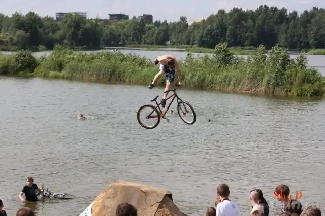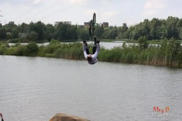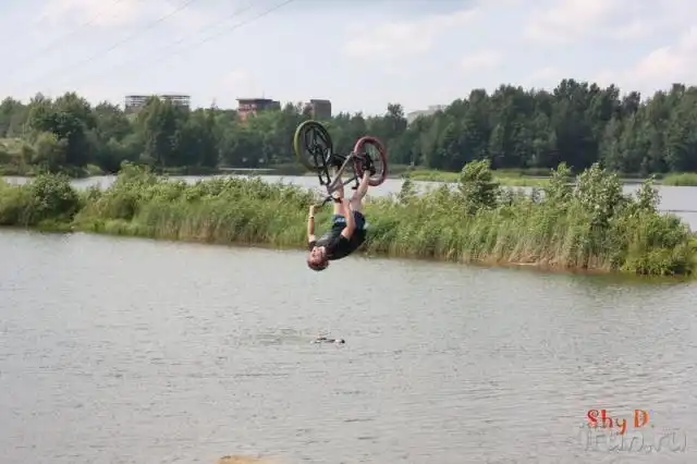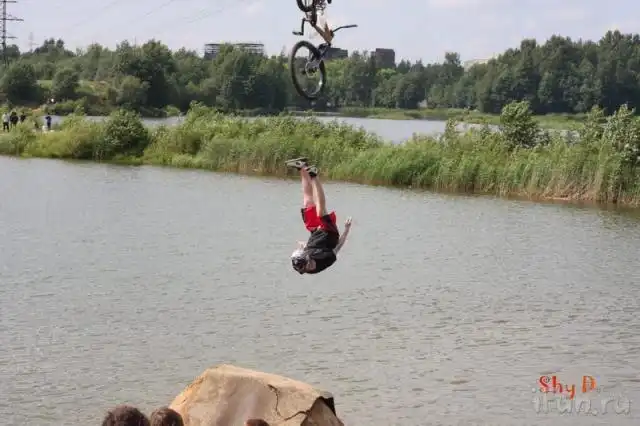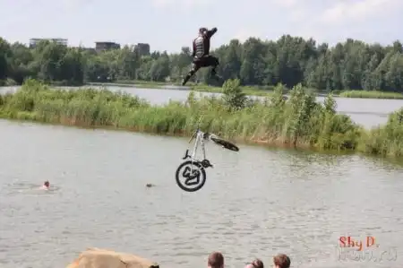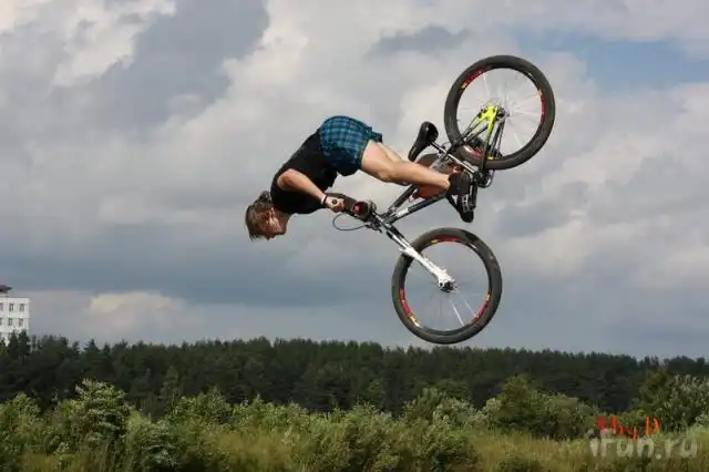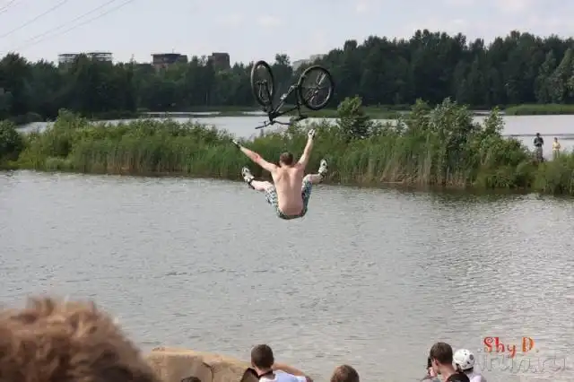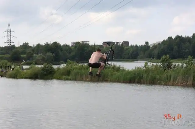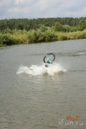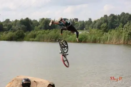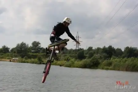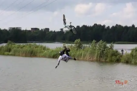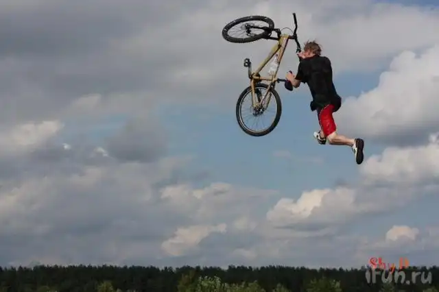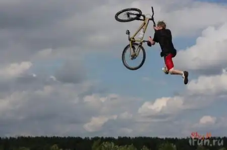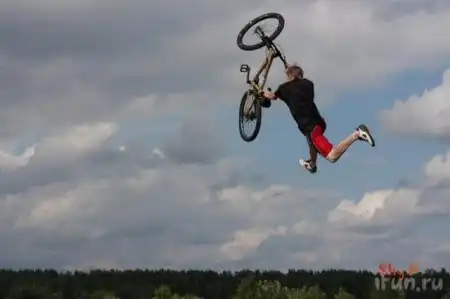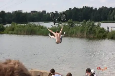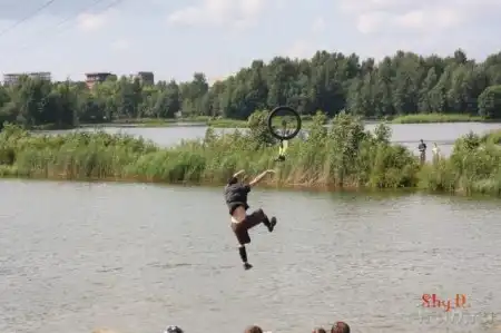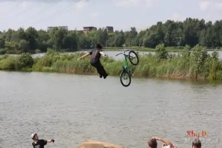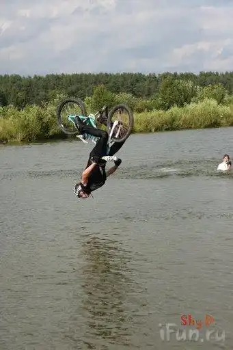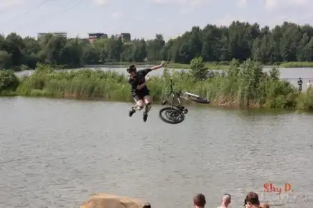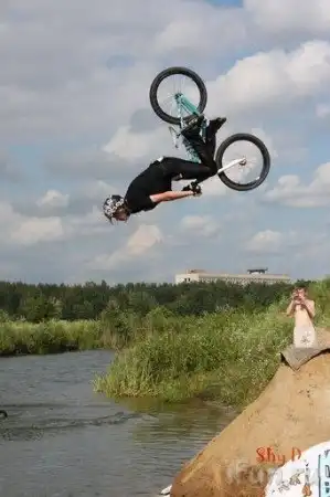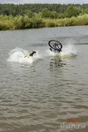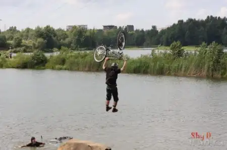 пусть либо без велика разбегаются и с вышки прыгают, либо на велике нормально приземляются