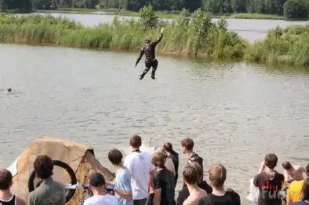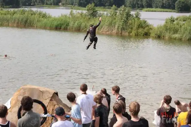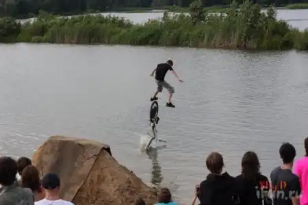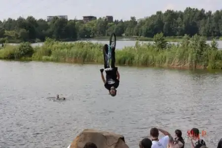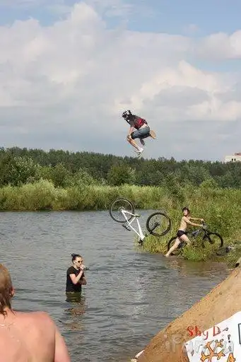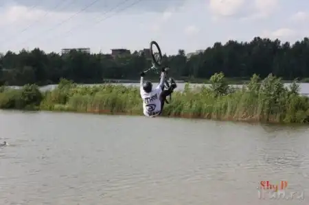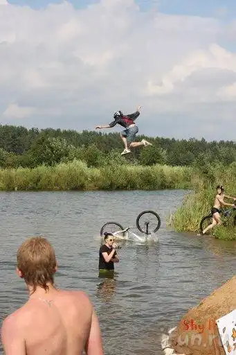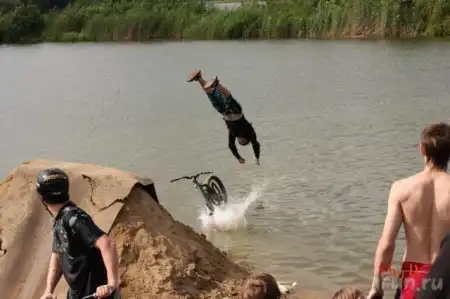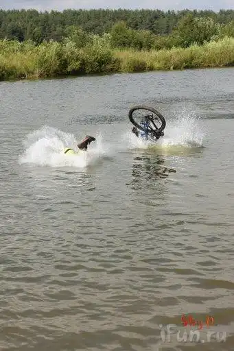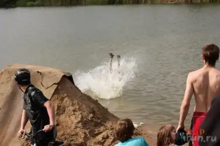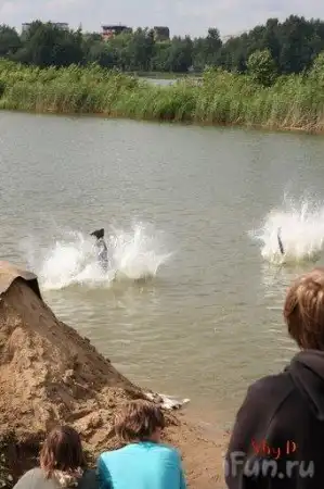 Разгон с крутого бережка, трамплин, пируэт и в воду!