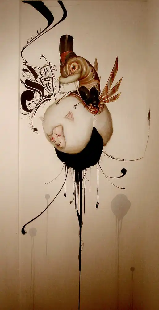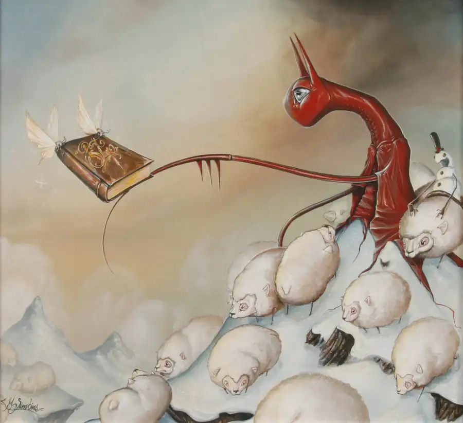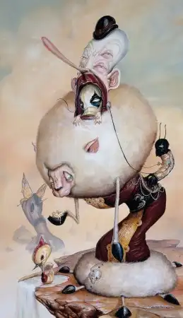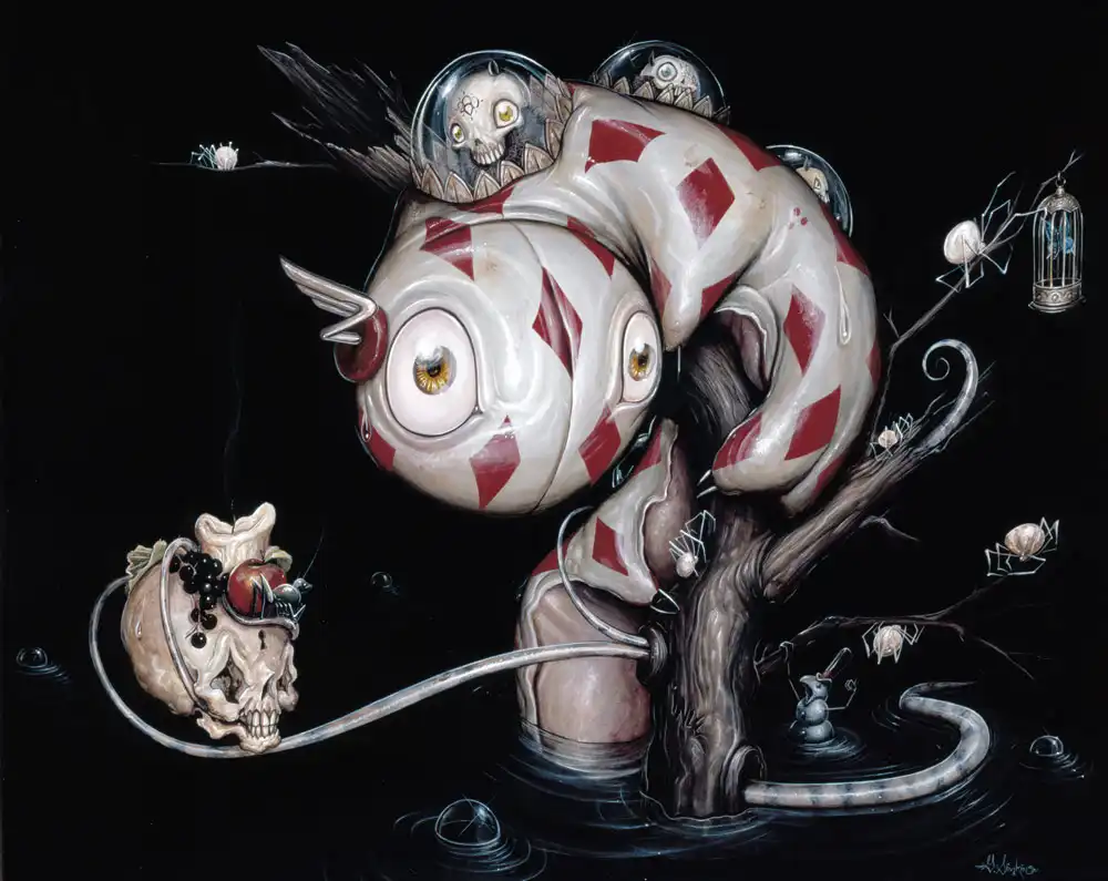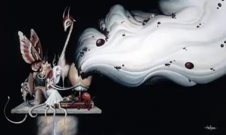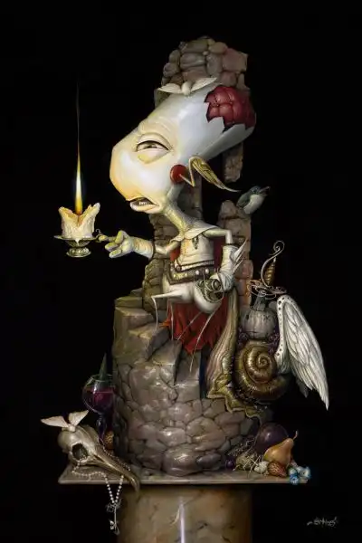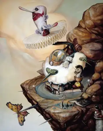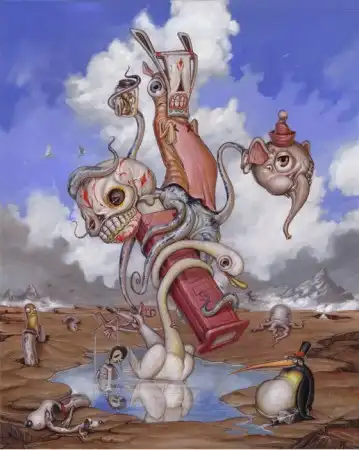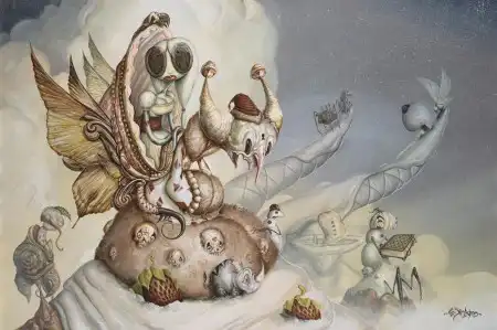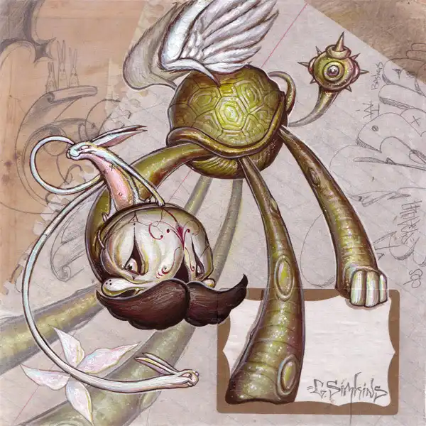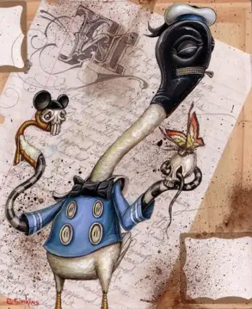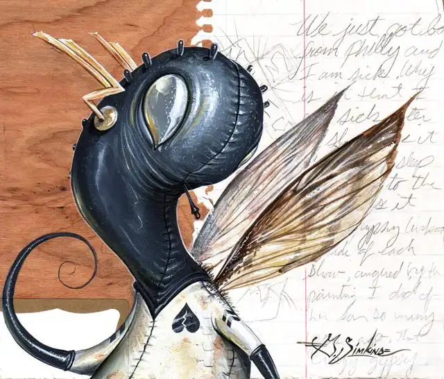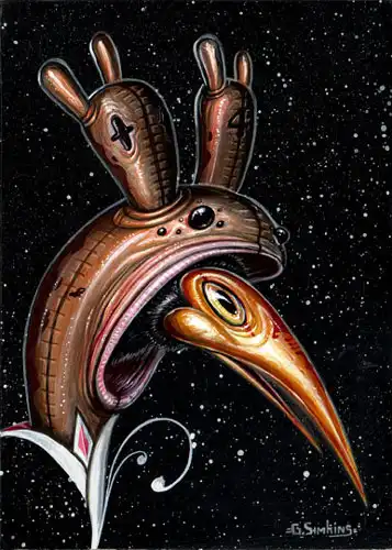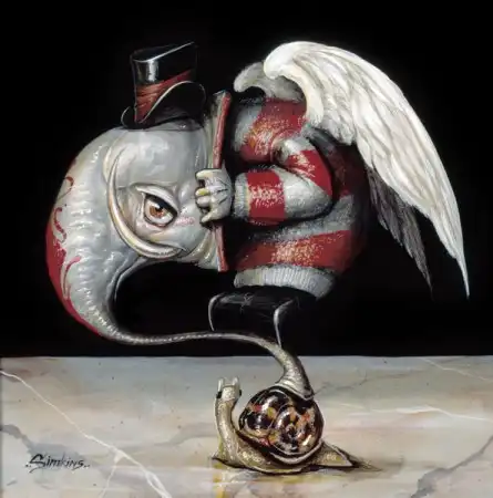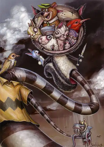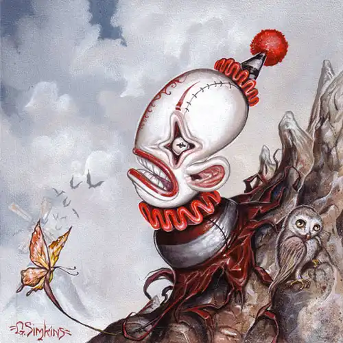 Он потратил многие годы, заполняя альбомы, разрисовывая стены и наконец нашел путь перенести их на холст. Интермедия фантазии, диковинного - то, с чем Вы сталкиваетесь в каждой работе Симкинса, вдохновленного элементами работ старых мастеров, природы, китча и исковерканного воображения.