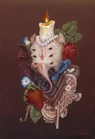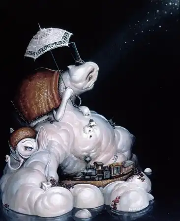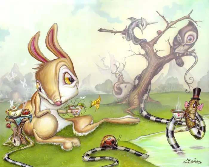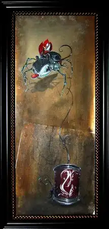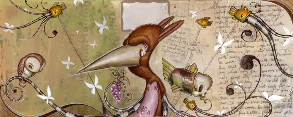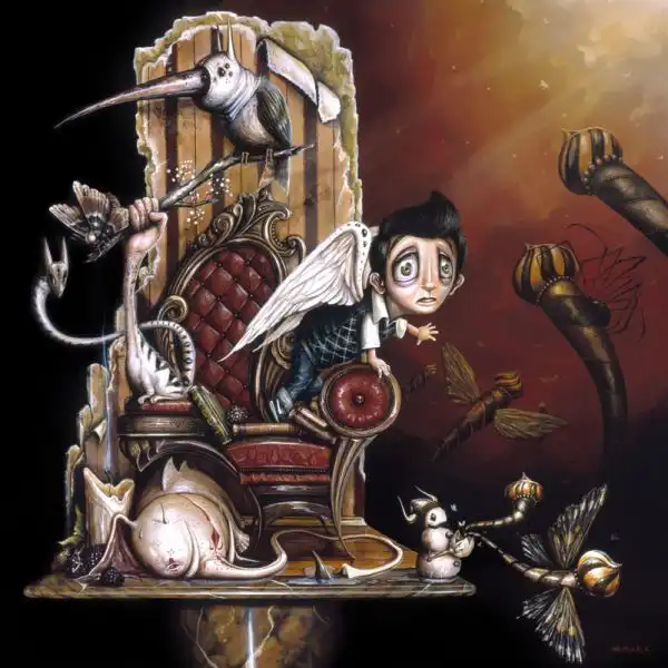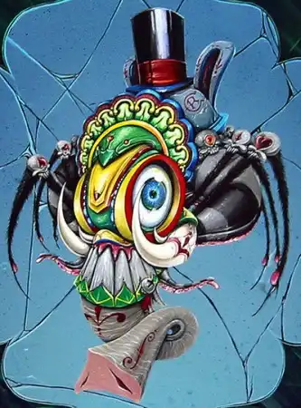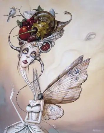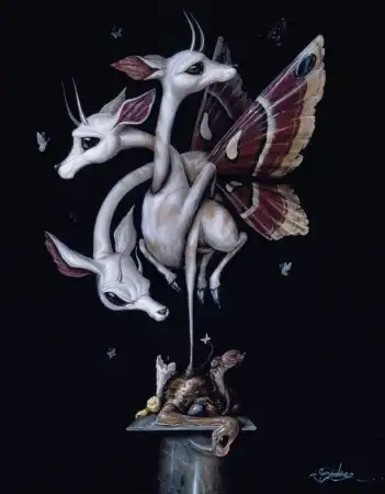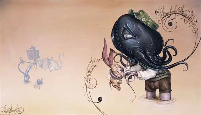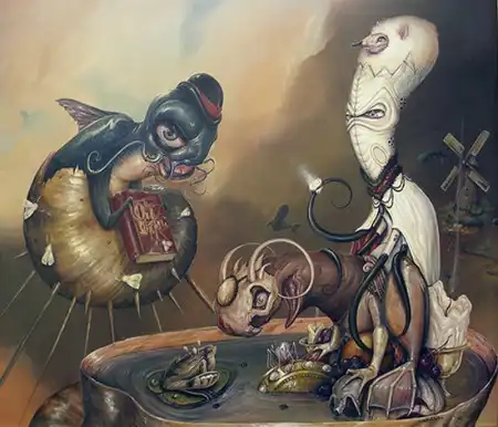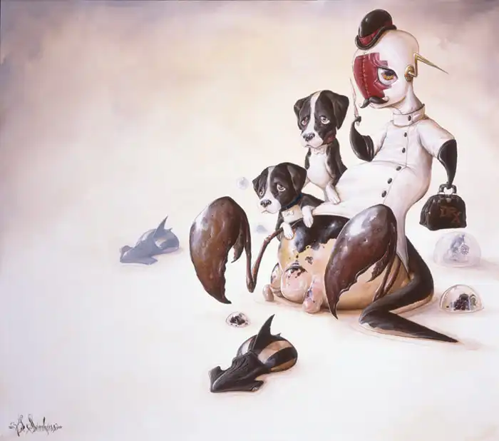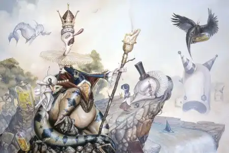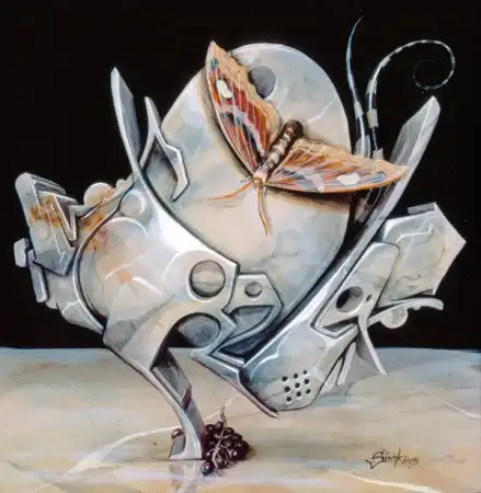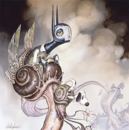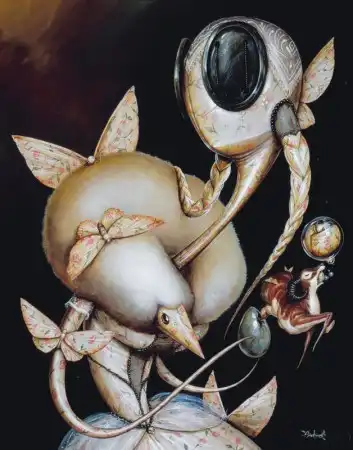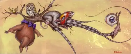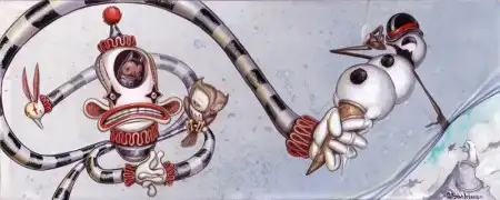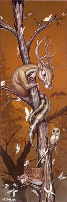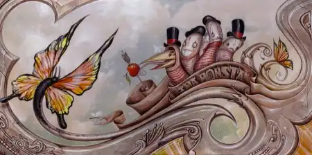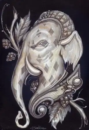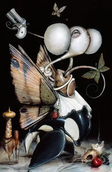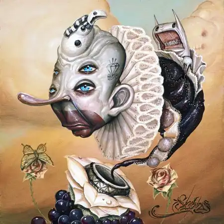 Он потратил многие годы, заполняя альбомы, разрисовывая стены и наконец нашел путь перенести их на холст. Интермедия фантазии, диковинного - то, с чем Вы сталкиваетесь в каждой работе Симкинса, вдохновленного элементами работ старых мастеров, природы, китча и исковерканного воображения.