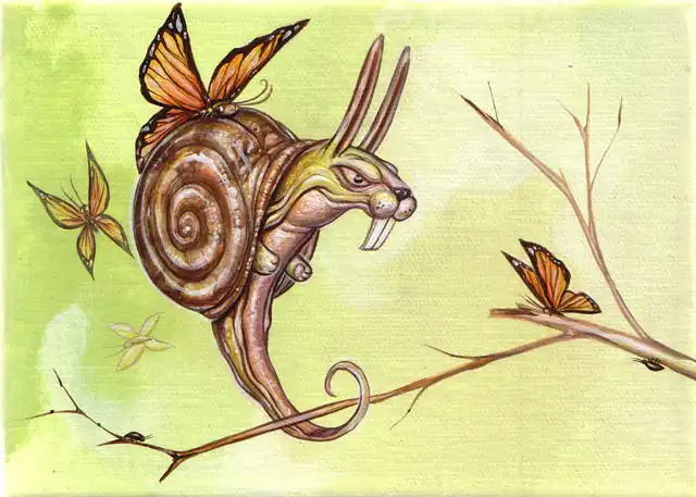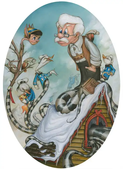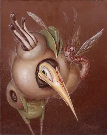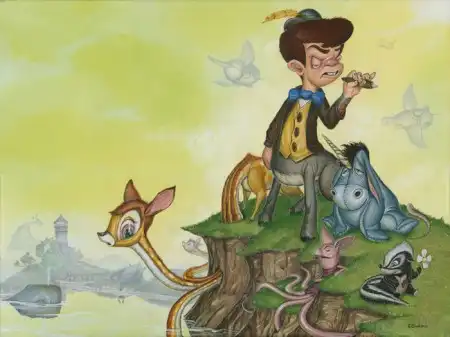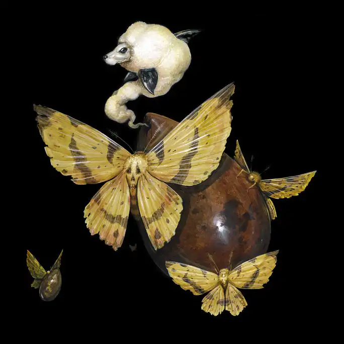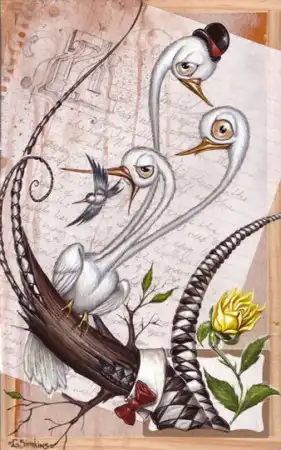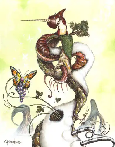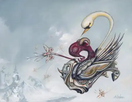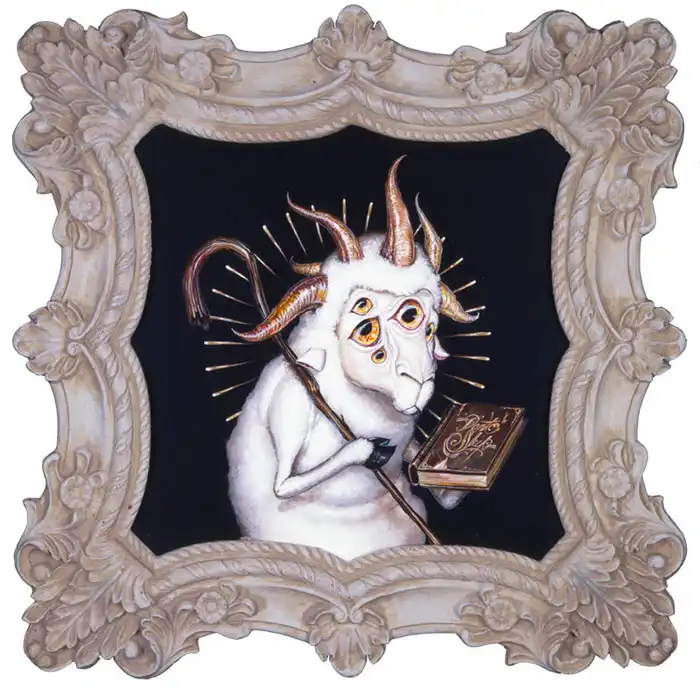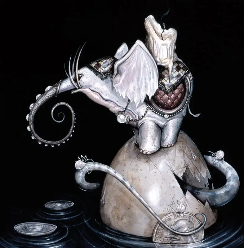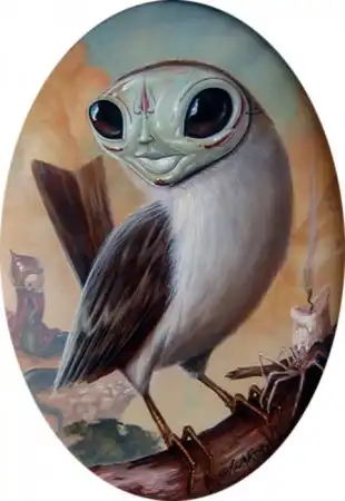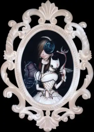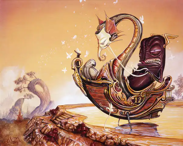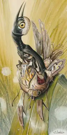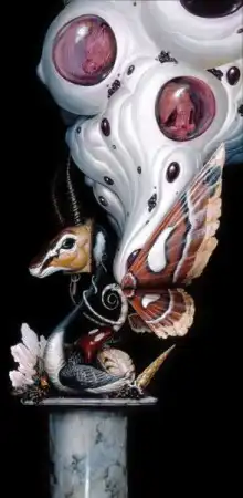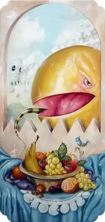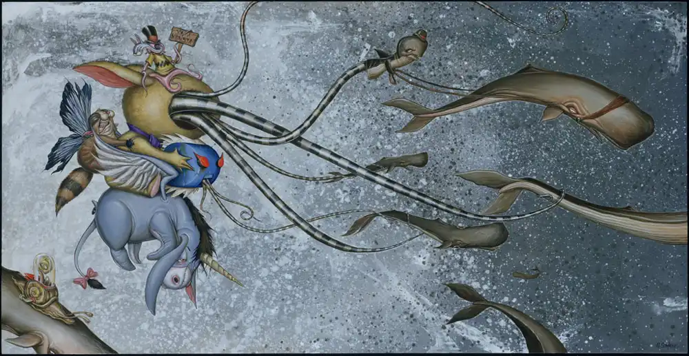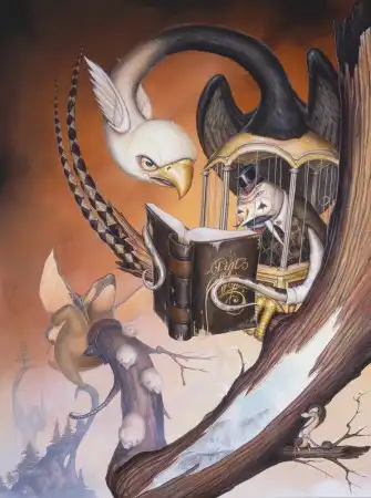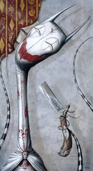 Он потратил многие годы, заполняя альбомы, разрисовывая стены и наконец нашел путь перенести их на холст. Интермедия фантазии, диковинного - то, с чем Вы сталкиваетесь в каждой работе Симкинса, вдохновленного элементами работ старых мастеров, природы, китча и исковерканного воображения.