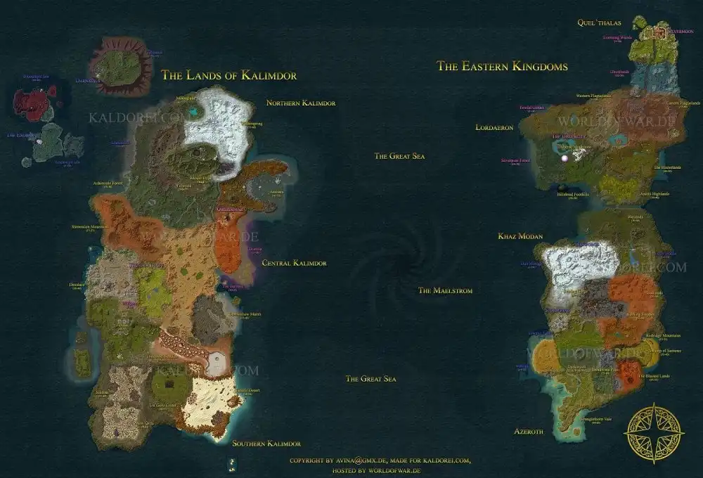 Массив Восточных королевств включает в себя два субконтинента — южный (на нем находятся государства Азерот и Хаз Модан) и северный континент Лордерон. В древности континенты Калимдор и Восточные Королевства были частью одного большого суперконтинента с Колодцем Вечности в центре. Когда колодец взорвался в конце Войны Древних, этот суперконтинент раскололся и принял существующий облик.