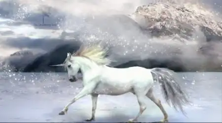 Одни пишет, что это лошадь (белой или черной масти) с винтовым рогом, в других источниках не винтовым.