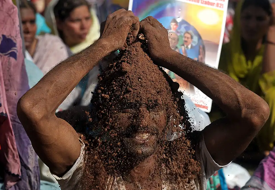 Бездомный пакистнский христианин обсыпает голову землей в знак протеста против полицейских облав на христианские семьи в Исламабаде, Пакистан.