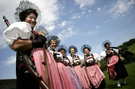 Женщины в традиционных костюмах на соревнованиях по стрельбе “Wyberschiesset” в Швейцарии.