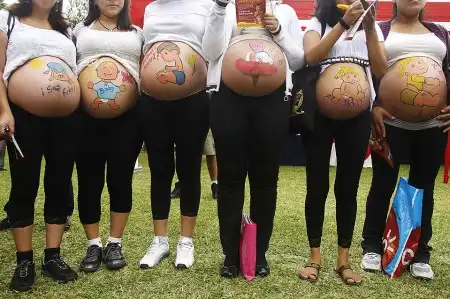 Беременные женщины с разрисованными животами на Наделе здорового материнства в Лиме, Перу.