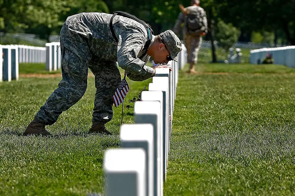 Капитан Ed Arntson из Чикаго целует могилу сержанта Henry Linck в Арлингтоне. Сержант Henry Linck был убит в Ираке в 2006 году. Воруженные силы установили более 300 000 флагов у могильных камней перед Мемориальным Днем.