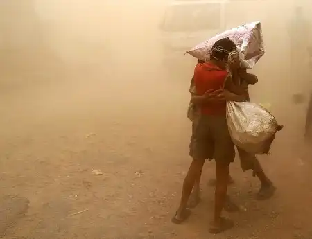 Люди держутся друг за друга во время песчаной бури в северо-индийском городе Матура.