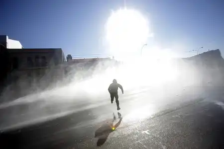 Демонстрант убегает от полицейского брансбойта в Вальпараисо, Чили.