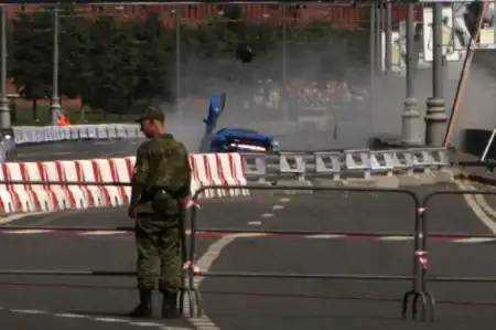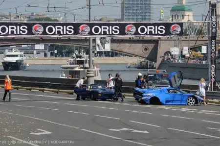 Не обошлось и без аварии - молодой человек на синем Bugatti EB 110 Super Sport не справился с управлением в повороте и врезался в отбойник. Гонку приостановили примерно на час.