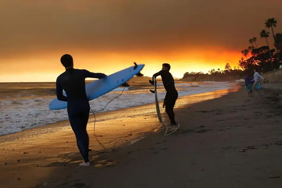 Серферы входят в воду в густом дыме от пожара Иесусита на пляже Баттерфляй 7 мая 2009 года в Монтесито, к югу от Санта- Барбары, штат Калифорния.