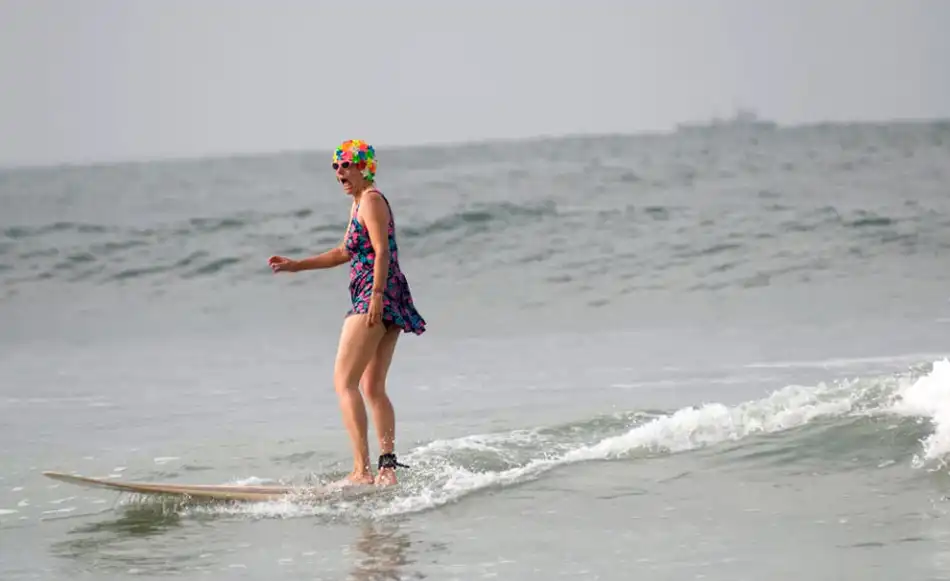 Старушка Джанет Хусден в костюме для серфинга принимает участие в седьмом ежегодном фестивале Ду Да Серф Дэй (Doo Dah Surf Day) на пляже Сансет Бич в Лос-Анджелесе 25 июля 2009 года.