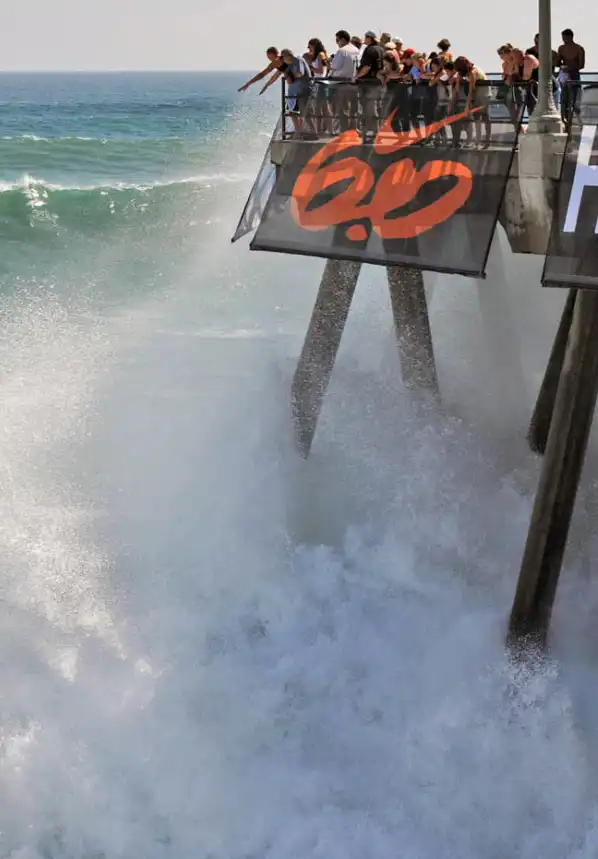 Толпа людей наблюдает за бушующими волнами с пирса на пляже Хантингтон в Оранж Каунти, штат Калифорния, 24 июля 2009 года. Раз в год шторм с Новой Зеландии приносит на Калифорнийское побережье целый накат ветровых волн.