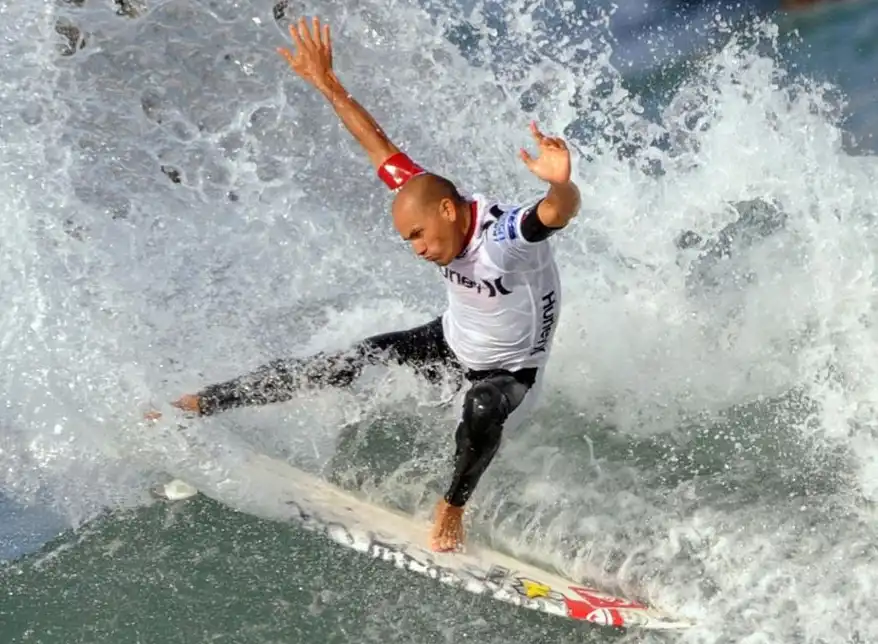 Легенда серфинга Келли Слэйтер из США в четверть финале перед поражением от Адриано де Суза из Бразилии на открытом чемпионате по серфингу на пляже Хантингтон в Оранж Каунти, штат Калифорния, 26 июля 2009 года. Местный парень Бретт Симпсон забрал первый приз в 100 000 долларов, победив австралийца Мика Фаннинга в финале, который проводился рядом с историческим пирсом Хантингтон.