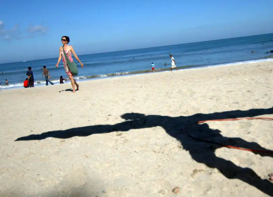 Тень туриста, несущего доску для серфинга на пляже Кута, в то время как другие туристы наслаждаются солнцем, пока жители острова голосуют в центре на острове Бали в июле 2009 года. Индонезия провела свои вторые президентские выборы с момента падения диктаторства Сухарто, и бывший генерал Сусило Бамбанг Юдхойоно был выбран на второй срок.