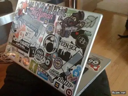 Вообще-то стикеры на буках и машинах считаются дурным тоном. Но профессионально изготовленные обложки для ноутов смотрятся хорошо и еще и защищают от царапин.
