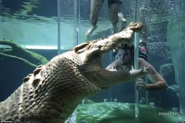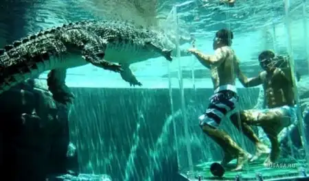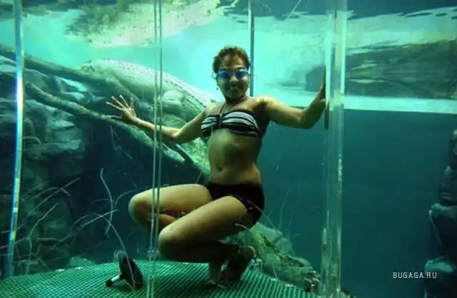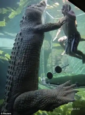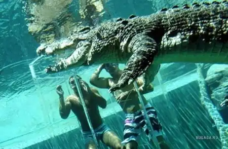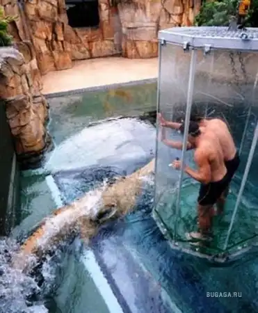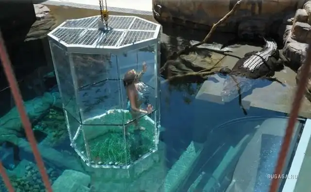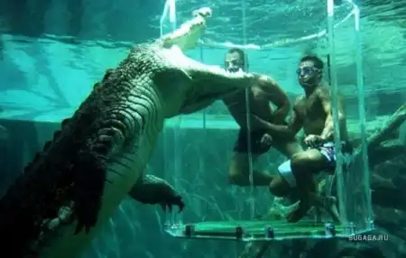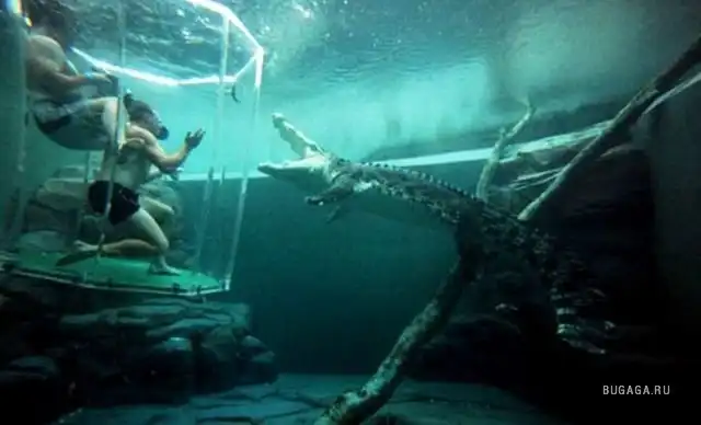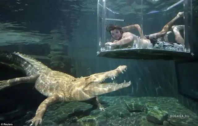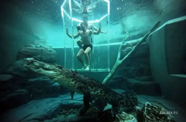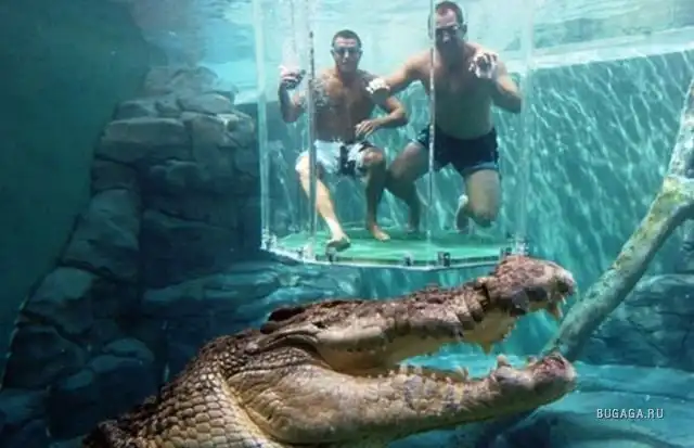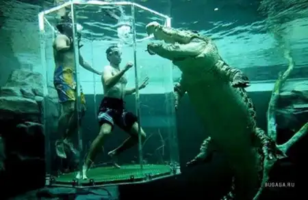 Желающих поразвлечься помещают в стеклянную капсулу и опускают в бассейн с огромным крокодилом…
