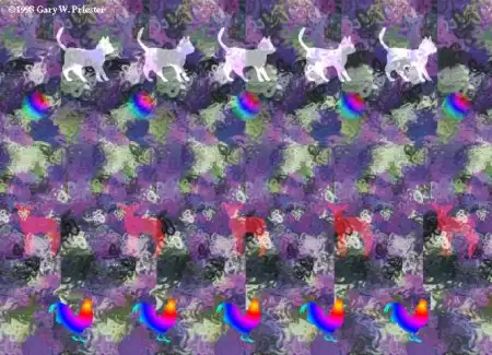При некоторой тренировке возможно получение объемного изображения при просмотре рисунка практически с любого расстояния 20 - 100 см в статическом режиме. Достаточно смотреть как-бы сквозь рисунок, вдаль, не концентрируя внимания на самом рисунке. Прояснение изображения наступает от 1 до нескольких секунд.