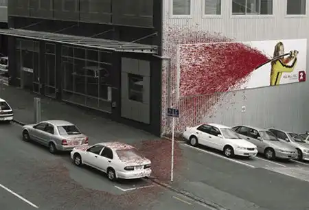 Постер к фильму Kill Bill. Довольно затратная реклама, особенно учитывая, что ее частью являются и две машины на проезжей части, «забрызганные» кровью. А что, если один из автомобилей угонят?